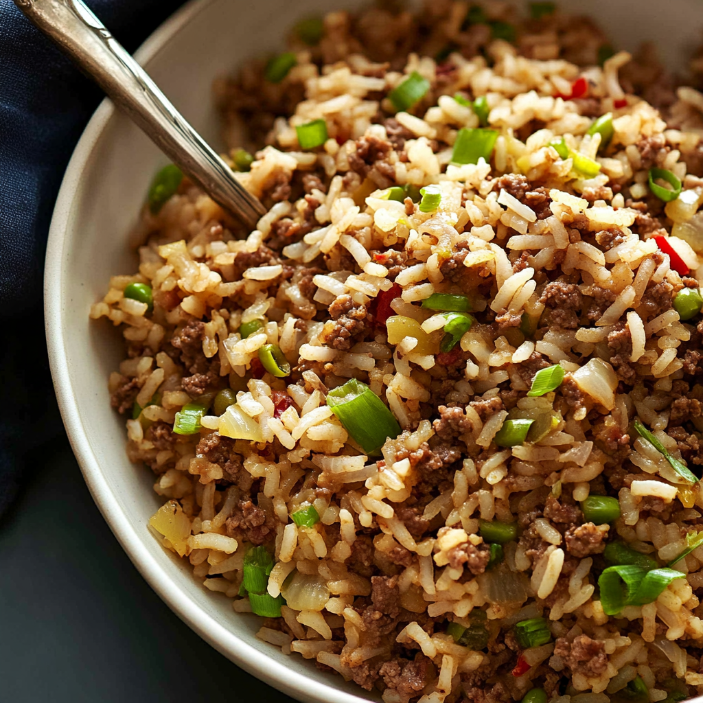 Imagine a plate of dirty rice with ground beef, steaming hot, a symphony of flavors dancing together like they’re at the best party in town. The spicy aroma wafts through the air, and you can almost taste the savory goodness before it even reaches your mouth. It’s rich, it’s hearty, and every bite is an explosion of flavor that feels like a warm hug on a chilly day.