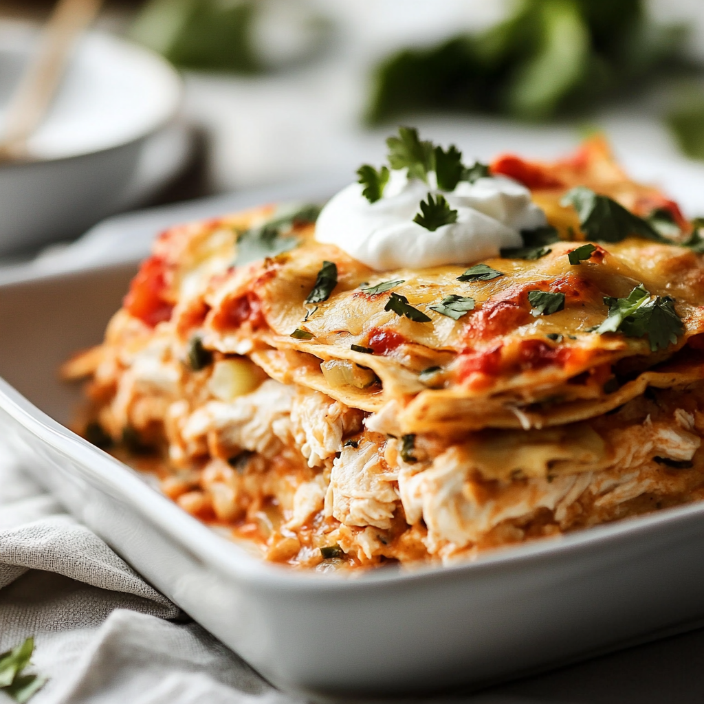 Chicken Tortilla Casserole is a cozy, crowd-pleasing dish that combines layers of tender chicken, zesty salsa, and gooey cheese wrapped in warm tortillas. This easy-to-make casserole is perfect for any occasion, from weeknight dinners to festive gatherings. With its rich flavors and colorful presentation, it invites everyone to the table for a satisfying meal that warms both the heart and the belly.