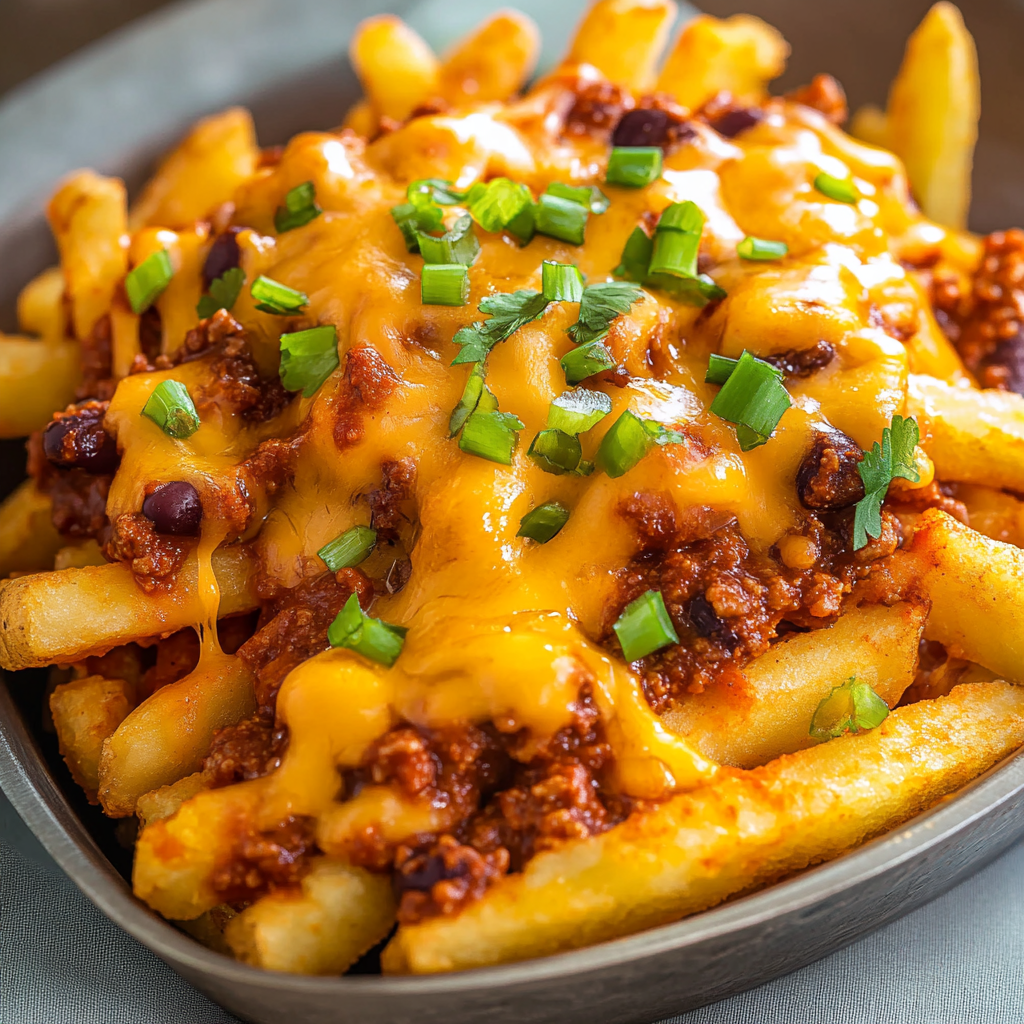 Assemble it All Together: Once fries are done, layer them on a serving platter. Pour that glorious chili over the fries generously, creating a mountain of deliciousness.