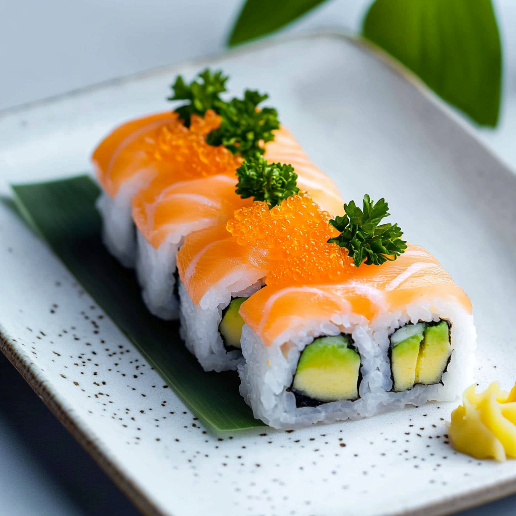Salmon sushi is a delightful fusion of flavors, combining the rich, buttery taste of fresh salmon with the tangy kick of soy sauce and wasabi. Just imagine biting into a perfectly rolled piece, where the creamy avocado and fragrant rice create a medley that dances on your taste buds.